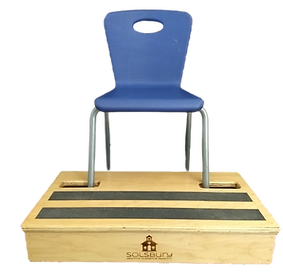 Wooden footrests which attach to classroom chairs have been used in schools for decades. School based physical therapists know that a footrest provides a stable surface for a students feet to rest upon. When a child's both feet are stabilized on a solid surface, postural control, sitting balance and the ability to focus are greatly improved. Here at Solsbury, our team didn't want to alter the look of the footrests used in schools for so many years. We simply wanted to make it better. Teachers frequently complain that their students either kick the footrest off of the chair or wrap their feet around the sides of the footrest and bang the cutouts against the legs of the chair. Not only does this result in the child's inability to focus but ultimately distracts the entire classroom. Our patent pending locking footrest is constructed from 3/4" maple plywood. It has three sides and a top surface. The open back allows the therapist or classroom staff to adjust or tighten the locking mechanism if needed. The anti-slip tape spans the entire top surface to reduce falls. The patent pending locking mechanism prevents shifting of the footrest. Our footrest is able to accommodate classroom chairs with an inside leg width of 11 1/2" to an outside leg width of 20". Our footrests come in 4" and 6" heights.